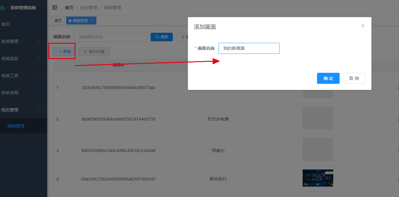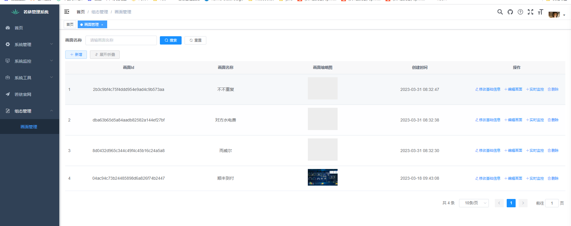 我们提供的组态插件只有编辑器和实时监控画面,并没有画面的列表功能,该功能需要你们自己去做,主要是操作表stage_data的增删改查,界面参考如下。该界面示例以【若依前后端分离项目-前端项目】为例去做的列表页面。若依项目地址http://doc.ruoyi.vip/,我们提供的压缩包包含了该项目,以及该功能的实现。