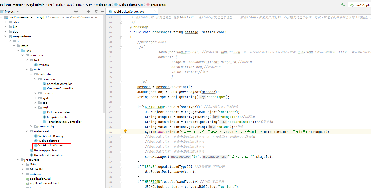 进入WebSocketServer.java 的 onMessage方法,该方法可以拿到画面点击按钮后要发送的命令字符串,传感器的id,画面id,拿到这几个数据后,自己想办法将命令组合成设备需要的格式,传给相应的硬件。代码位置下图所示: